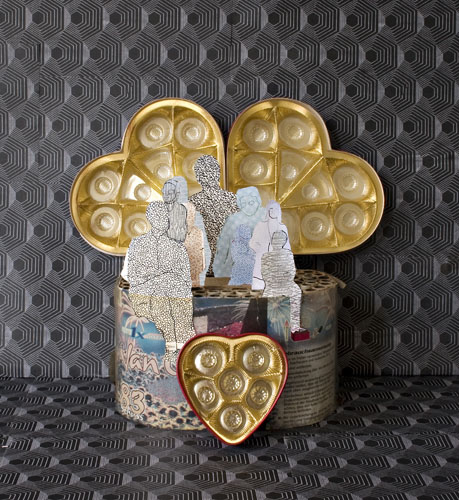 Installation von Feuerwerkskörper und Pralinenschachteln, div. farbige Papiere